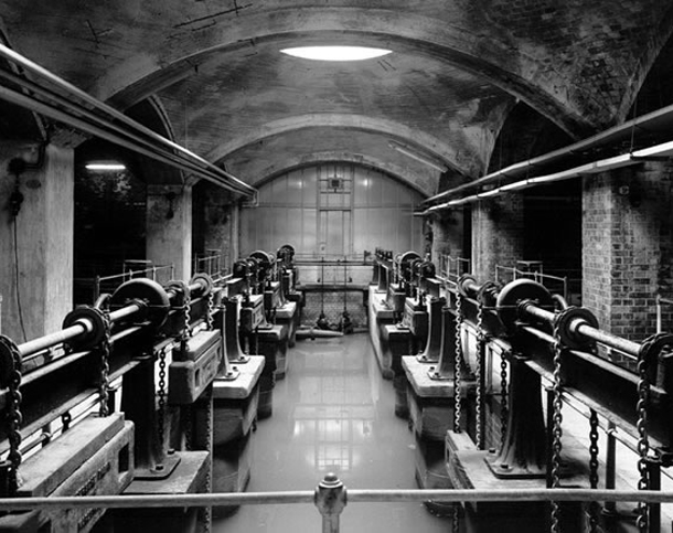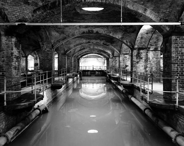 Die vier unterirdischen Absetzbecken von je 82 m Länge waren für ca. 140.000 Einwohner bemessen. Der Weg des Abwassers durch die Kläranlage begann am Sandfang.